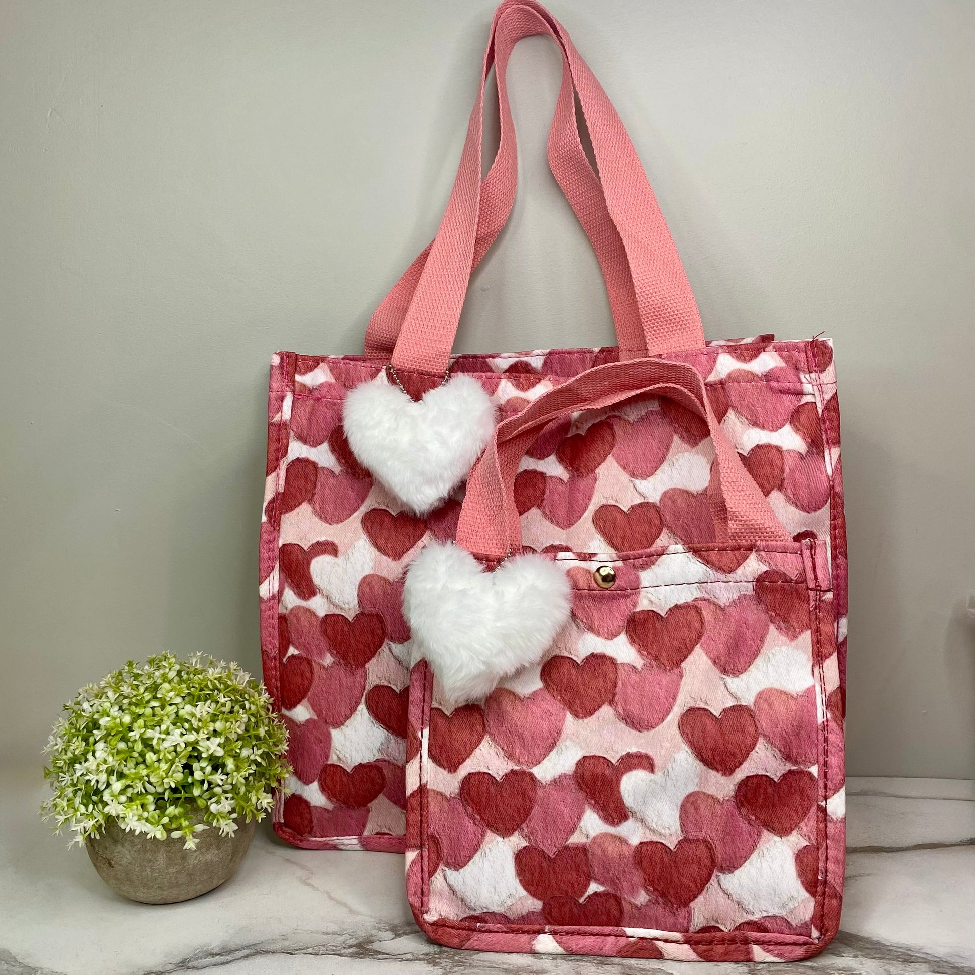 The cutest tote bags are ready for anything. Available in a small and large size, you can pick what suits your needs or do a “mommy and me” set! Comes with white Pom Pom heart keychain.