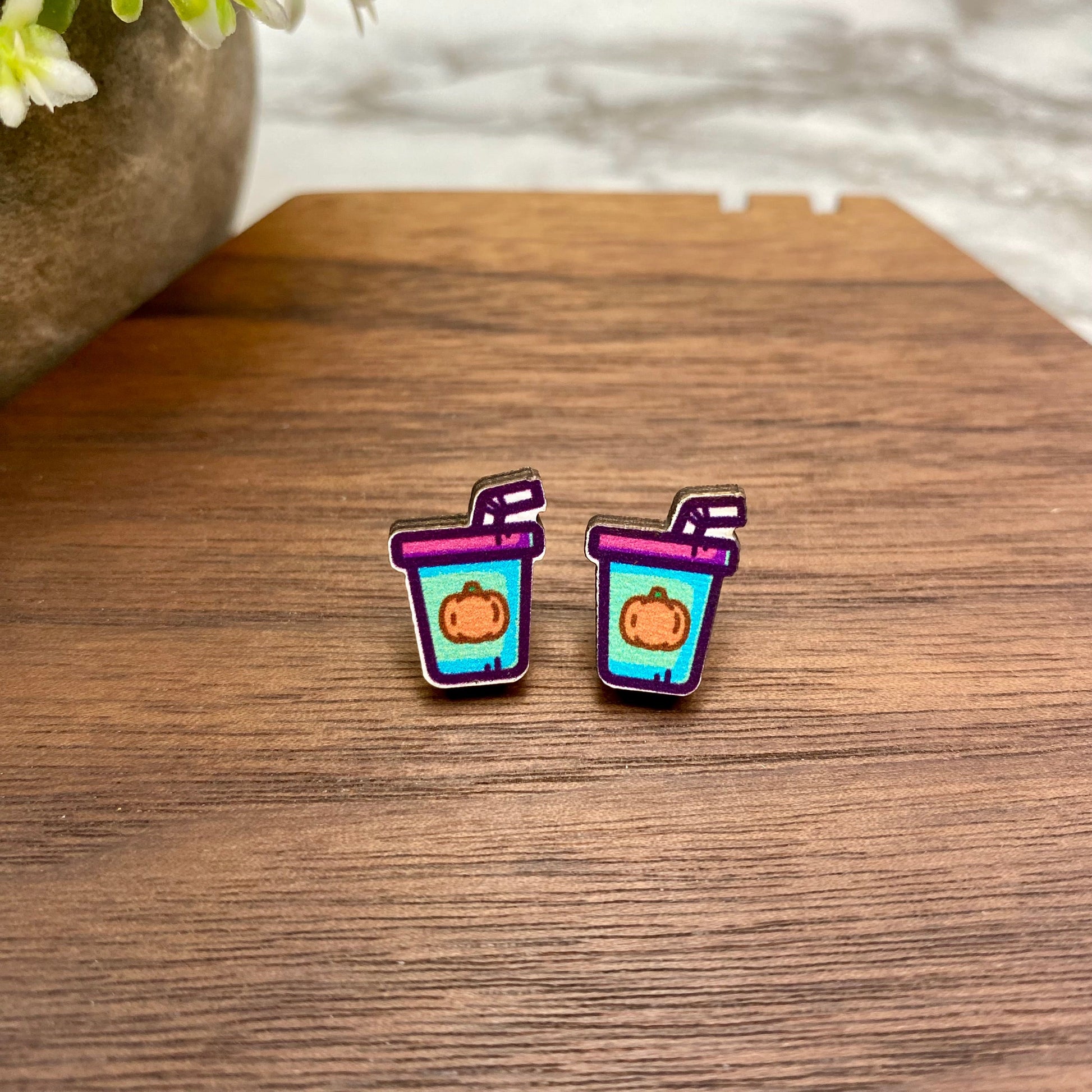 Wooden Stud Earrings - Halloween - Blue Pumpkin Cup